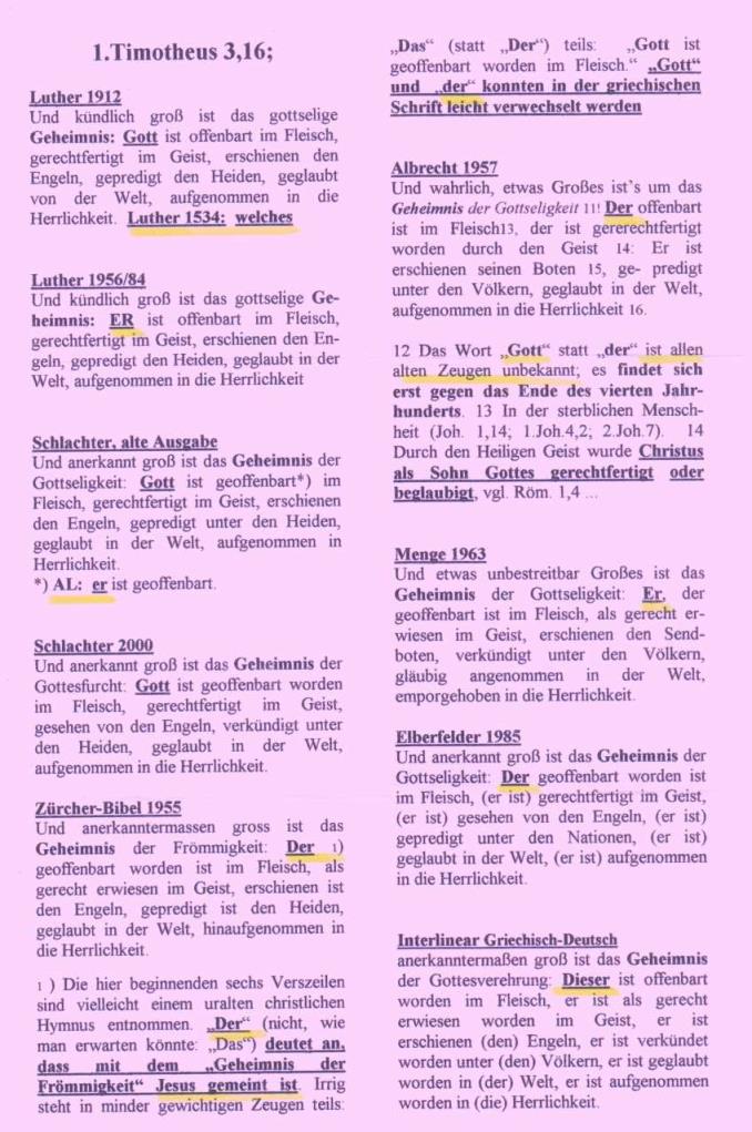1. Tim 3,16 ALBRECHT = UND WAHRLICH, ETWAS GROSSES IST’S UM DAS GEHEIMNIS DER GOTTSELIGKEIT! DER * OFFENBART IST IM FLEISCH, DER IST GERECHTFERTIGT WORDEN DURCH DEN GEIST: ER IST ERSCHIENEN SEINEN BOTEN, GEPREDIGT UNTER DEN VÖLKERN, GEGLAUBT IN DER WELT, AUFGENOMMEN IN HERRLICHKEIT. * das Wort “Gott” statt “der “ ist allen alten Zeugen unbekannt; es findet sich erst gegen das Ende des vierten Jahrhunderts LUTHER 1534 = “... UND KÜNDLICH GROS IST DAS GOTTSELIG GEHEIMNIS / WELCHES IST OFFENBARET IM FLEISCH / weiter 1545: ... GERECHTFERTIGT IM GEIST, ERSCHIENEN DEN ENGELN, GEPREDIGT DEN HEIDEN, GEGLAUBT VON DER WELT, AUFGENOMMEN IN DIE HERRLICHKEIT.” revidierte ELBERFELDER = “UND ANERKANNT GROSS IST DAS GEHEIMNIS DER GOTTSELIGKEIT: DER GEOFFENBART WORDEN IST IM FLEISCH ...” MENGE = “Und etwas unbestreitbar Erhabenes ist das Geheimnis der Gottseligkeit*: ER *, der offenbar geworden ist im Fleisch ...” * Anm. d. Übers.: d.h. das den Frommen zur Gottseligkeit kundgewordene Geheimnis. LUTHER 1534 + EL = Und kündlich groß ist das Geheimnis der Heiligkeit: welches ist offenbart im Fleisch, gerechtfertigt im Geist, erschienen den Engeln, gepredigt den Heiden, geglaubt von der Welt, aufgenommen in Herrlichkeit. KJV + EL + LUTHER 1534 = And without controversy great is the mystery of holiness: which was manifest in the flesh, justified in the Spirit, seen of angels, preached to the Gentiles, believed on in the world, received up into glory. Joh 1,1.14; 3,16; Röm 1,4; Gal 4,4; Eph 1,20.21; Apg 28,28; Lk 1,11; Mark 1,11; 16,19