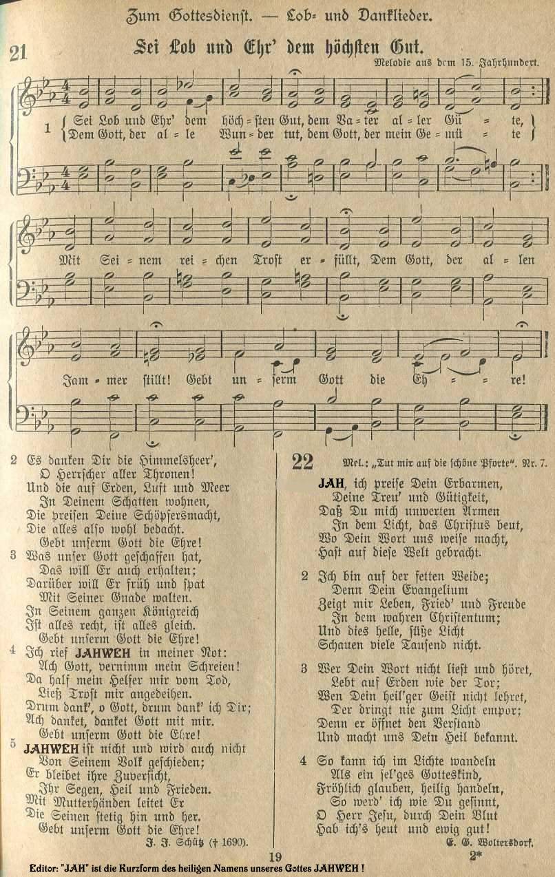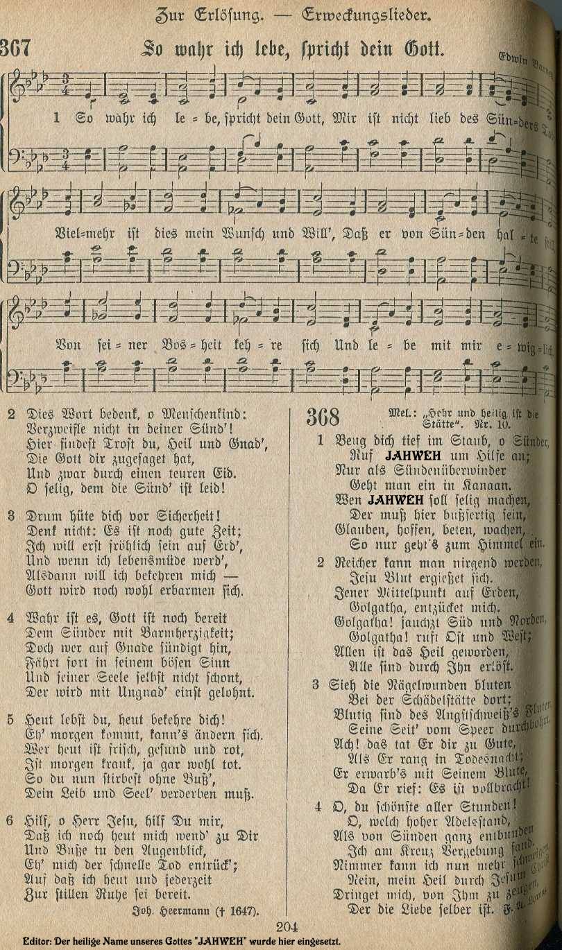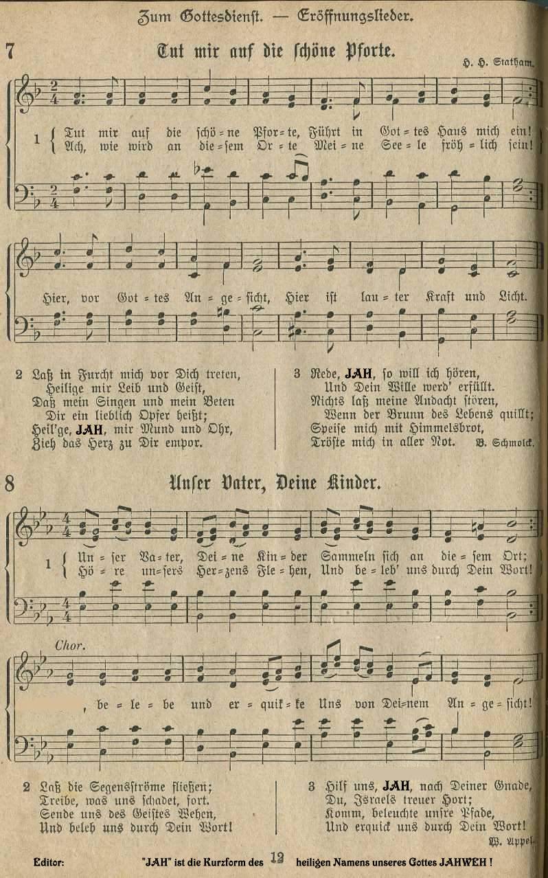 Hinweis zum adventistischen Gemeindeliederbuch in Amerika Der Text des Liedes “Holy, holy, holy, God in three persons, blessed trinity” ( deutsch: “Heilig, heilig, heilig, Gott in drei Personen, gesegnete Dreieinigkeit”) stammt ursprünglich aus dem Liederbuch der protestantischen Kirche. Die Adventpioniere änderten im Jahr 1886 diesen Text. Er lautete nun: “Heilig, heilig, heilig, Gott über allem, der die Ewigkeit regiert”. Die Gründe für diesbezügliche Veränderungen sind weiter hinten im Vorwort des deutschsprachigen Zionsliederbuches - 1893 von der Generalkonferenz der STA / Review and Herald herausgegeben - nachzulesen. Fast einhundert Jahre lang sangen die amerikanischen STA den Text dieses Liedes in Übereinstimmung mit der Bibel: “Heilig, heilig, heilig, Gott über allem, der die Ewigkeit regiert” Nachdem aber im Jahr 1980 die 27 Glaubenspunkte in Dallas neu formuliert wurden, musste auch hier eine Neuformulierung - bzw. die Rückkehr zur ursprünglichen trinitarischen Version von 1826 — vorgenommen werden. Ob man vielleicht verhindern wollte, dass die Gemeindeglieder über Ursachen und Gründe nachdenken - falls ihnen der Unterschied zwischen dem von den Adventpionieren aus biblischen Gründen veränderten Kirchenlied und den neuformulierten Glaubensgrundsätzen der STA auffällt? Seit 1985 sind die STA in Amerika zur evangelischen Version zurückgekehrt und singen nun wieder: